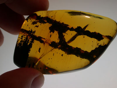 In the Dominican Republic, Hymenaea trees are called Algorrobo. The Hymenaea tree exudes vast amounts of resin which over millions of years of pressure hardens into amber. Generally amber is found because a landslide along a steep slope in the mountains exposes veins of black lignite. If the lignite contains amber it is gradually extracted by digging along the vein with picks and shovels. After the amber is found it is chiseled by hand out of the shaft walls, put into burlap sacks and passed out of the mine where it is separated from the rock by machete. Larger chunks of amber make it possible to view inclusions almost immediately by holding the amber up to sunlight to determine if a large inclusion has been discovered. Fossil bearing amber is polished locally.